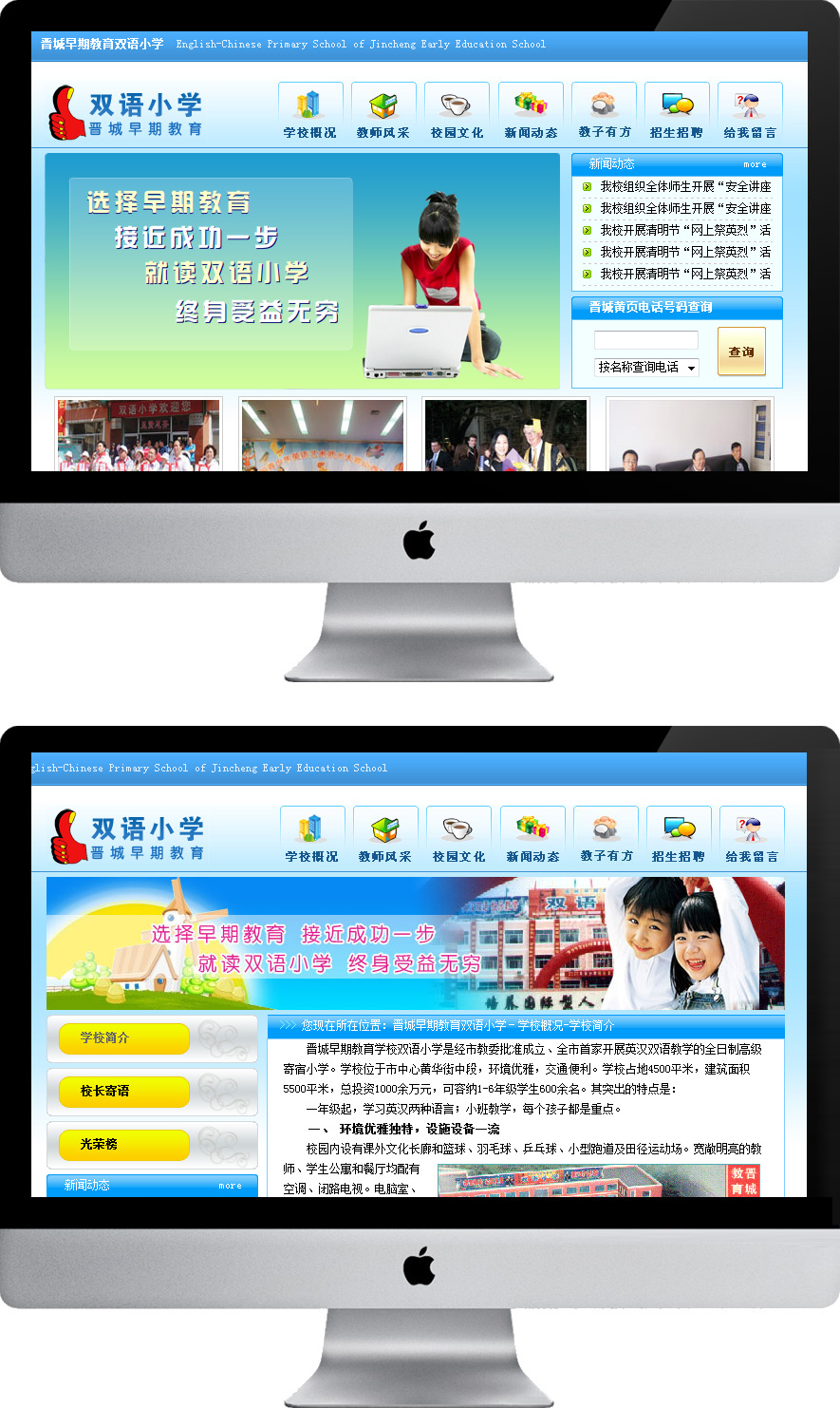 晉城早期教育學(xué)校雙語小學(xué)是經(jīng)市教委批準(zhǔn)成立、全市首家開展英漢雙語教學(xué)的全日制高級寄宿小學(xué)。學(xué)校位于市中心黃華街中段,環(huán)境優(yōu)雅,交通便利。學(xué)校占地4500平米,建筑面積5500平米,總投資1000余萬元,可容納1-6年級學(xué)生600余名。其突出的特點(diǎn)是: